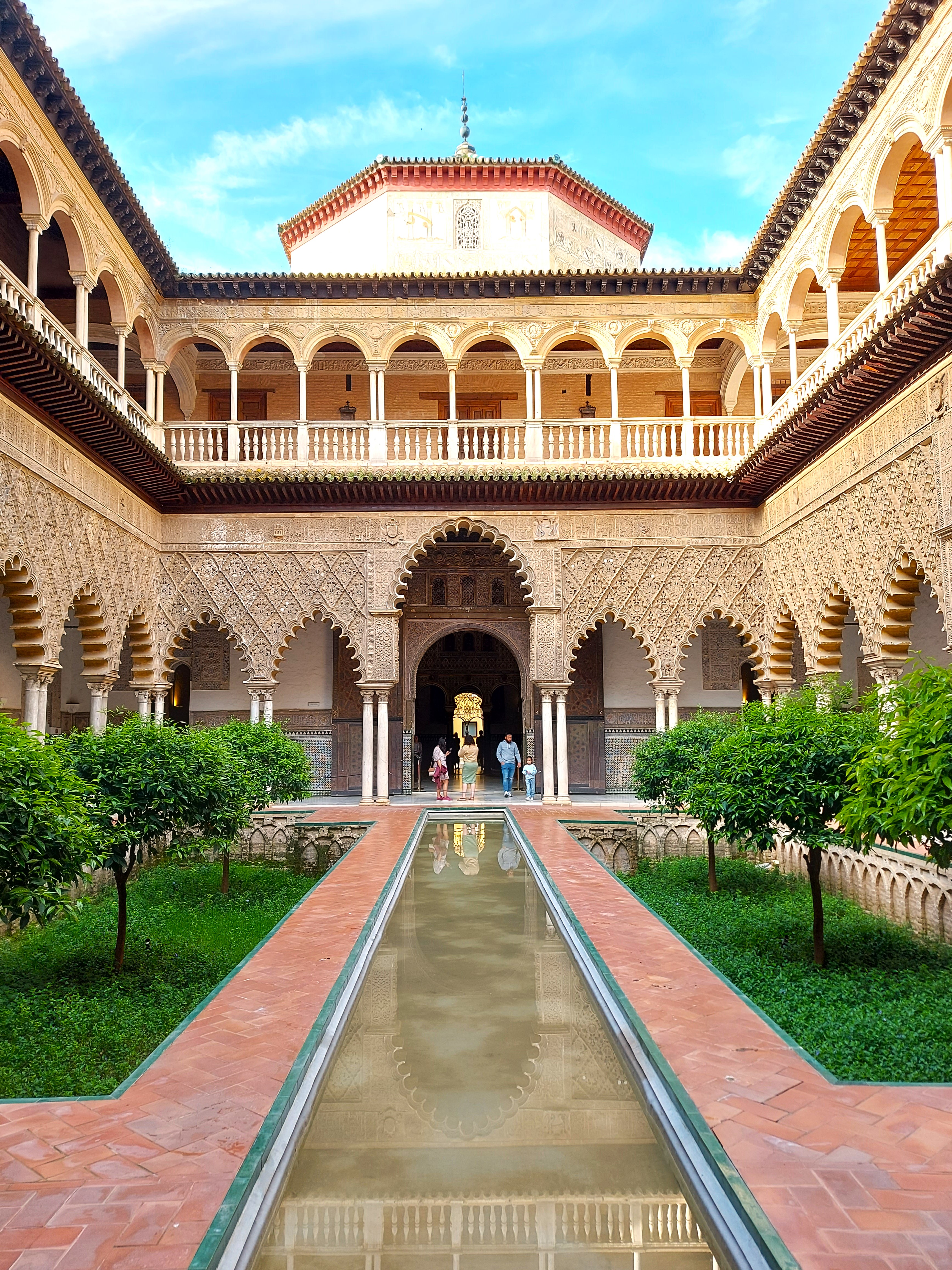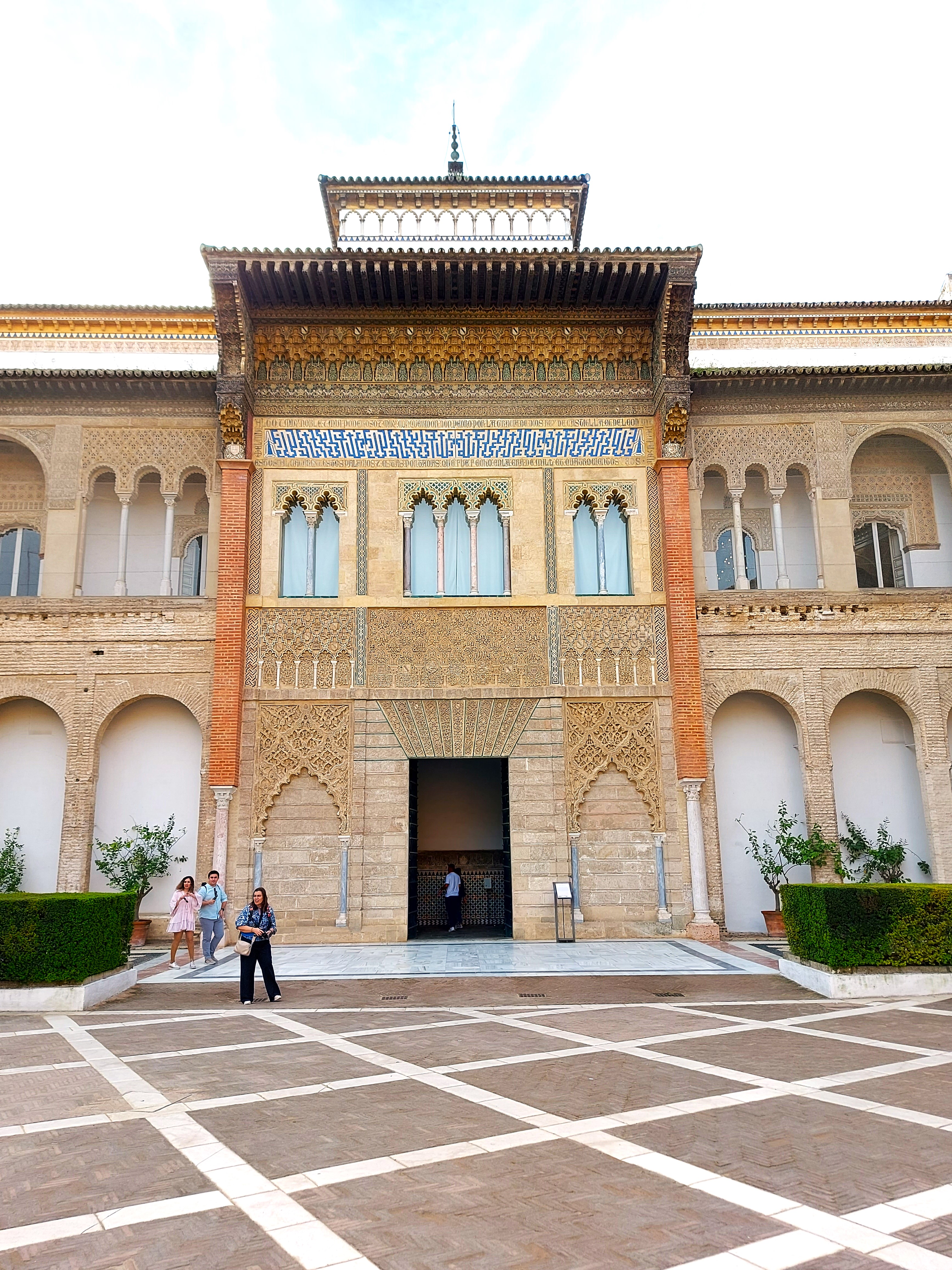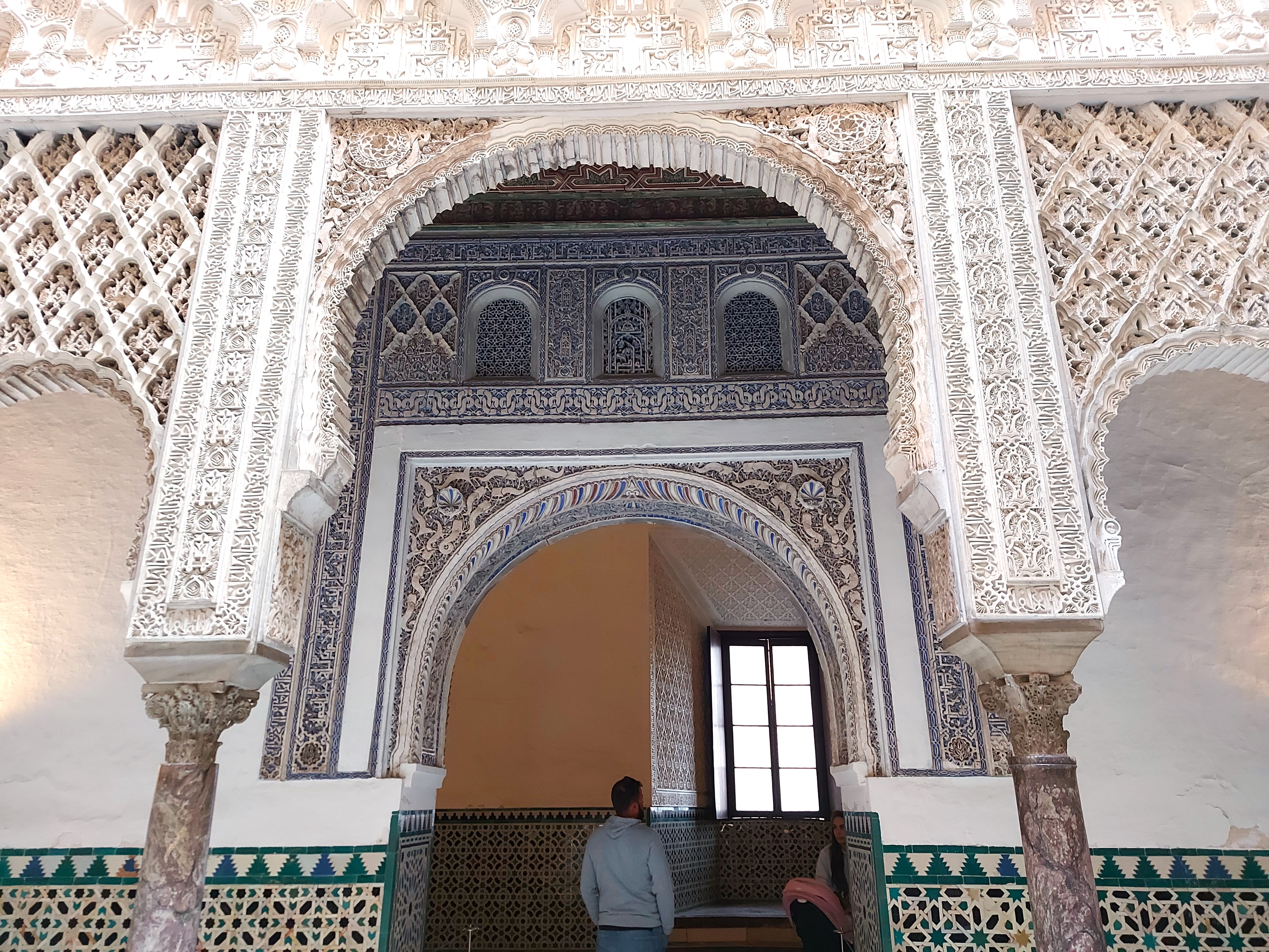 Takoj po vhodu pridemo na dvorišče, ki hitro pokaže svojo podobo v slogu mudejar, to zlasti velja za pročelje palače, ki je narejeno v čipkastem slogu (sebka). Zelo zanimivo je notranje dvorišče s kanalom, ki teče po sredini in s pomarančnimi drevesi, ki so posajena poleg. To naj bi imitiralo islamskih sedem nebes, posledično nosi ime Deviško dvorišče. Palača, ki se nahaja okrog dvorišča, je bila dokončana v 16. stoletju.