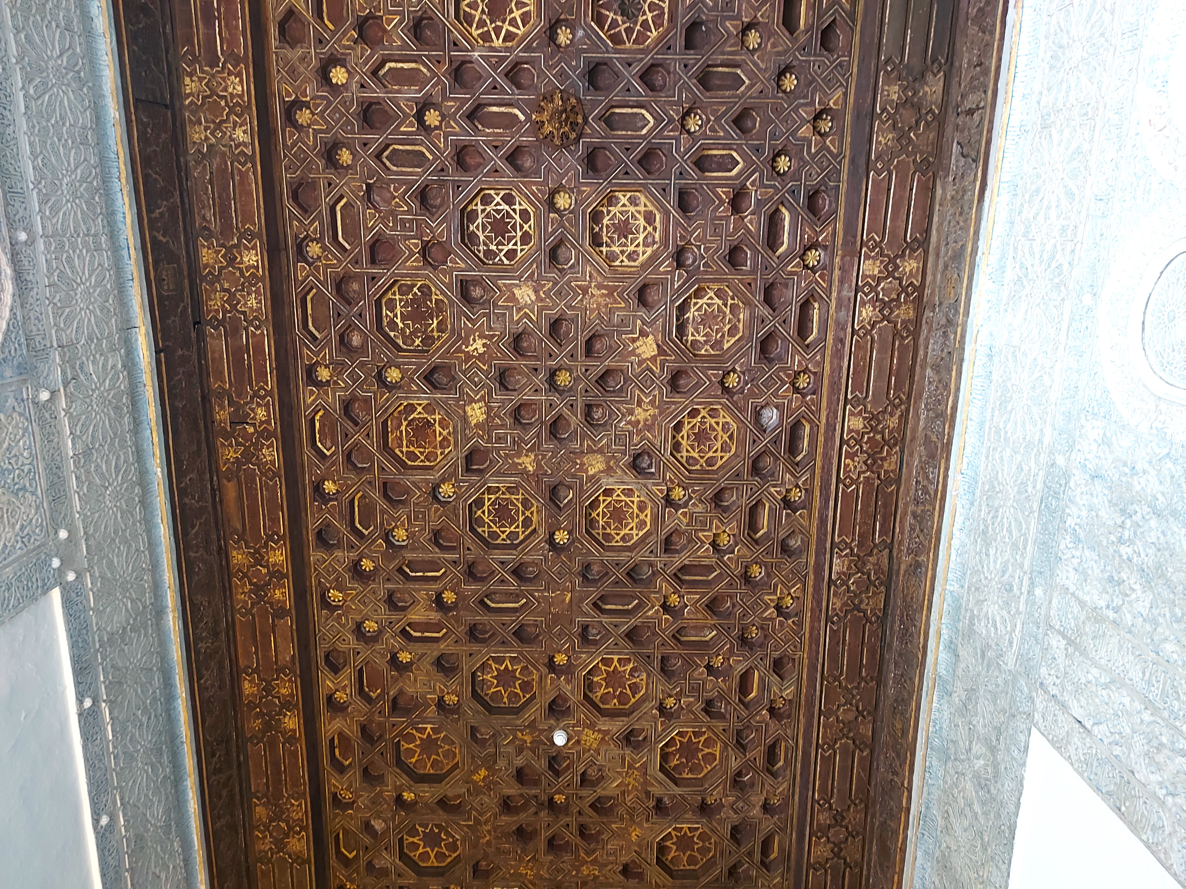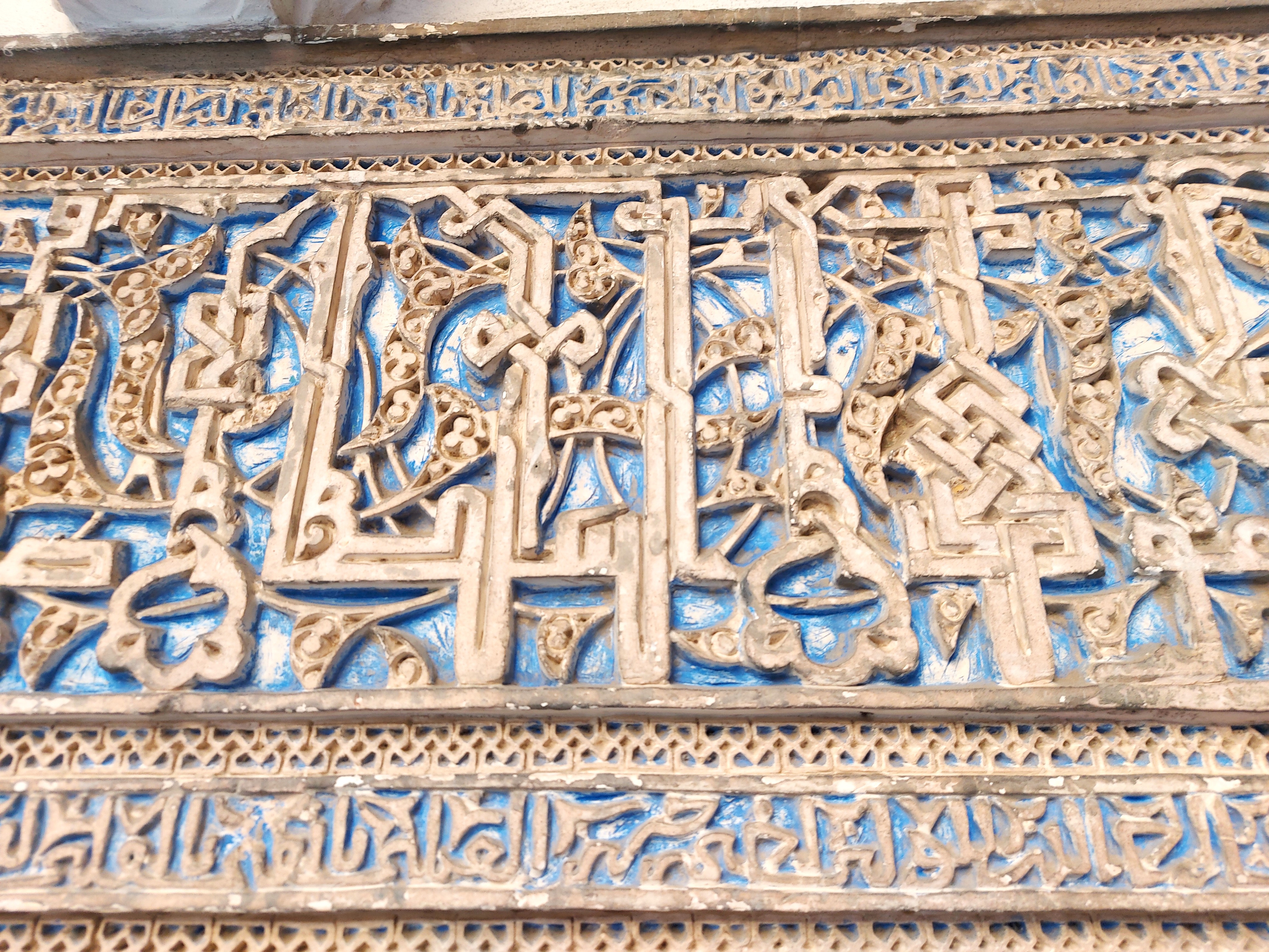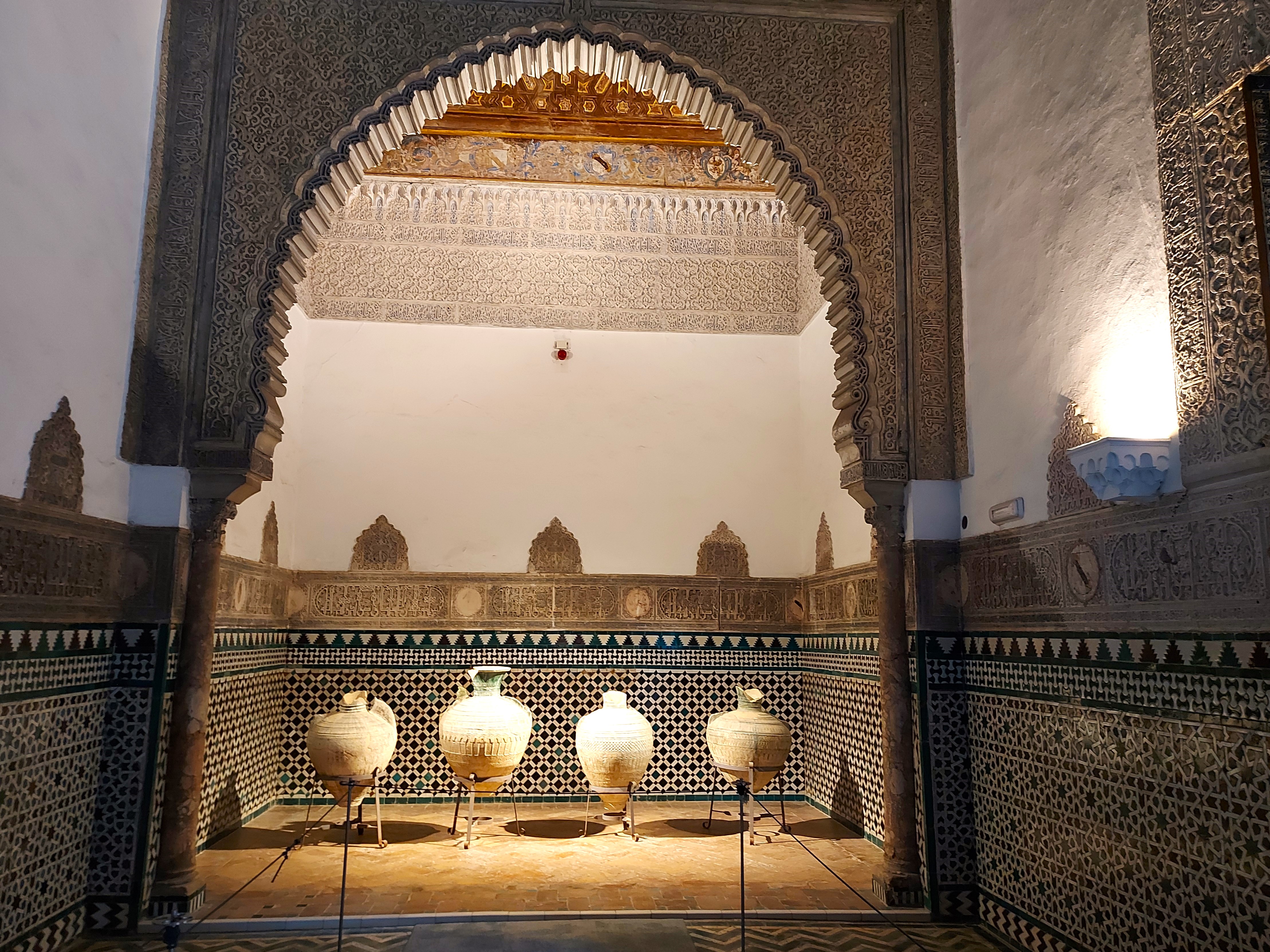 Takoj po vhodu pridemo na dvorišče, ki hitro pokaže svojo podobo v slogu mudejar, to zlasti velja za pročelje palače, ki je narejeno v čipkastem slogu (sebka). Zelo zanimivo je notranje dvorišče s kanalom, ki teče po sredini in s pomarančnimi drevesi, ki so posajena poleg. To naj bi imitiralo islamskih sedem nebes, posledično nosi ime Deviško dvorišče. Palača, ki se nahaja okrog dvorišča, je bila dokončana v 16. stoletju.