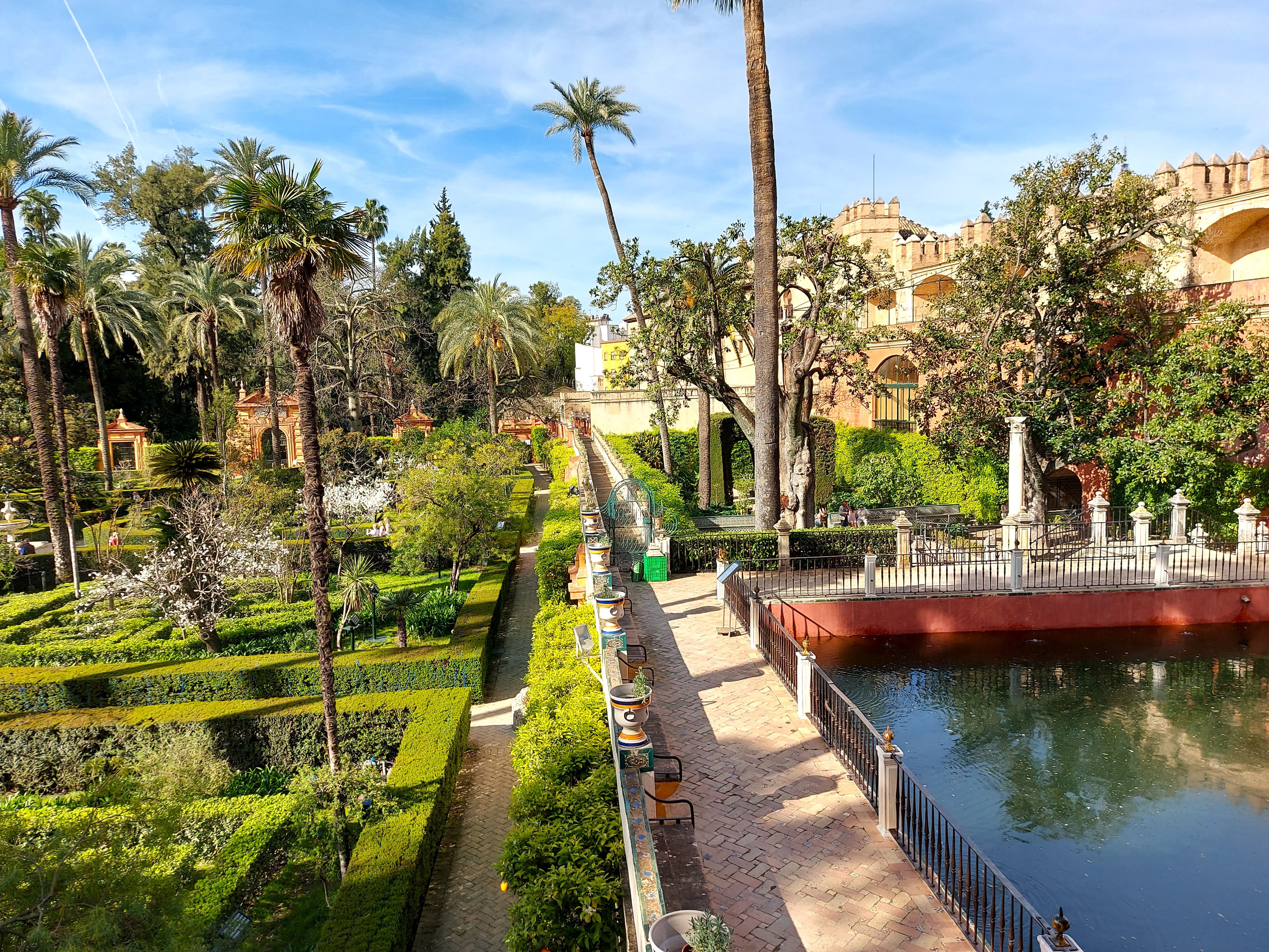 Poseben pečat dajejo palači bujni vrtovi, kjer se nahaja tako tropsko kot avtohtono rastje in nudijo pribežališče pred poletno pripeko. Tu se nahaja paviljon Karla V. Iz vrtov je moč vstopiti v slikovite kopeli Kraljice Marije, ki so kasneje služile kot cisterna. Najlepši pogled na vrtove se nahaja iz galerije, ki se dviguje nad njimi.