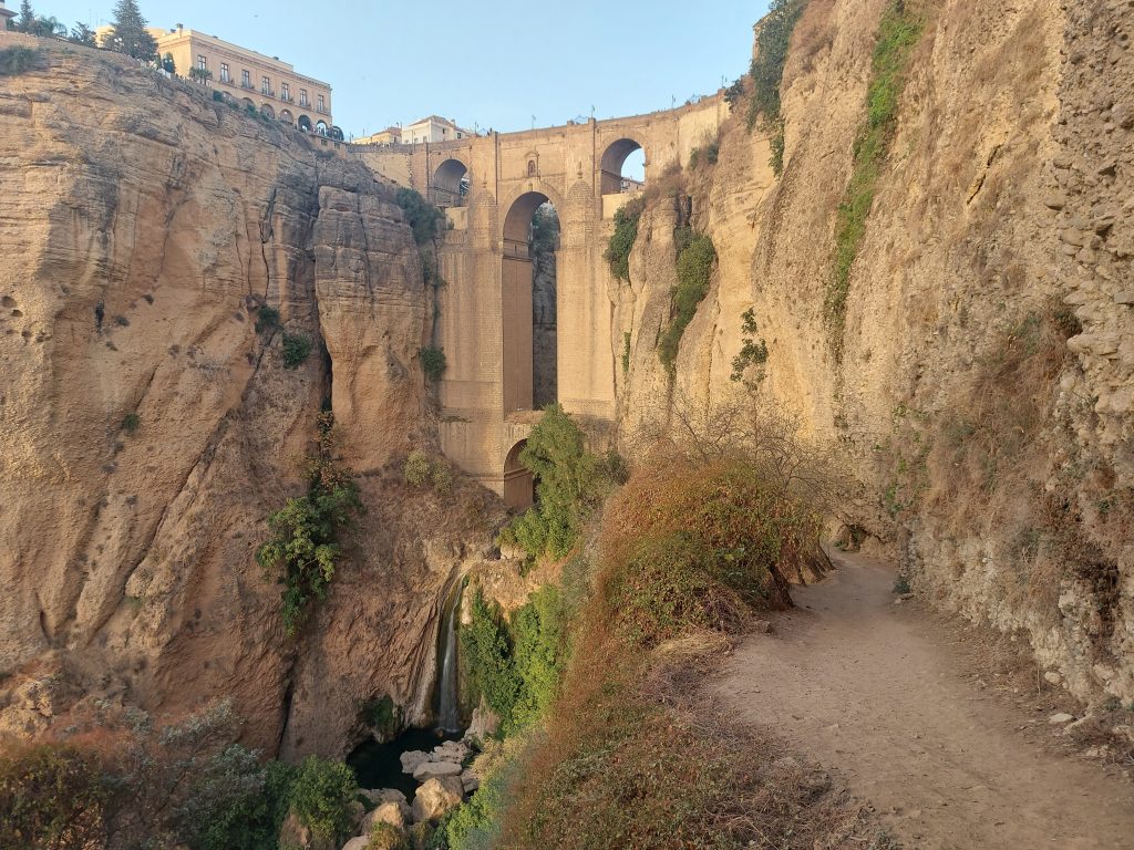 Ker samo en pohod na dan ni vedno nujno dovolj, smo dodali še enega. Mesto Ronda se nahaja na vrhu kanjona El Tajo, čez katerega je speljan tudi znameniti Puente Nuevo. Sprehod smo začeli na mostu, nadaljevali smo skozi staro mestno jedro, ki smo ga zapustili pri mestnih vratih. Zavili smo ostro desno, kjer se je pot začela spuščati vedno bolj strmo navzdol. Nad seboj smo že imeli pogled na ruševine nekdanje alcazabe, ob sami poti pa smo videli številne povsem posušene kaktuse. Nehote smo se začeli norčevati, da je v Rondi tako toplo in tako malo dežja, da še kaktusi ovenijo. Spust, ki so ga na eni strani spremljali nasadi oljk, na drugi pa vedno strmejše stene kanjona, nas je pripeljal do parkirišča. Tu se je odprl prelep direkten pogled na Puente Nuevo ter na strme stene, uzreti pa je bilo mogoče tudi manjše naravno okno. Sprejeli smo odločitev, da se po strmi poti vzpnemo do arabskih ruševin z zelo lepo razgledno točko, kjer se nahaja najlepši pogled na most. Tam smo se odločili, da gremo po poti neposredno pod sam most. Ta je sicer nezaščitena, a široka, nudi pa izredno lep pogled na slap in tolmun, ki se nahajata neposredno pod mostom. Ko smo prišli do mostu, smo žal ugotovili, da je nadaljnja pot zamejena z železnimi vrati. Tako smo se ponovno odpravili navzgor v mesto, kjer smo si privoščili zaslužen počitek.