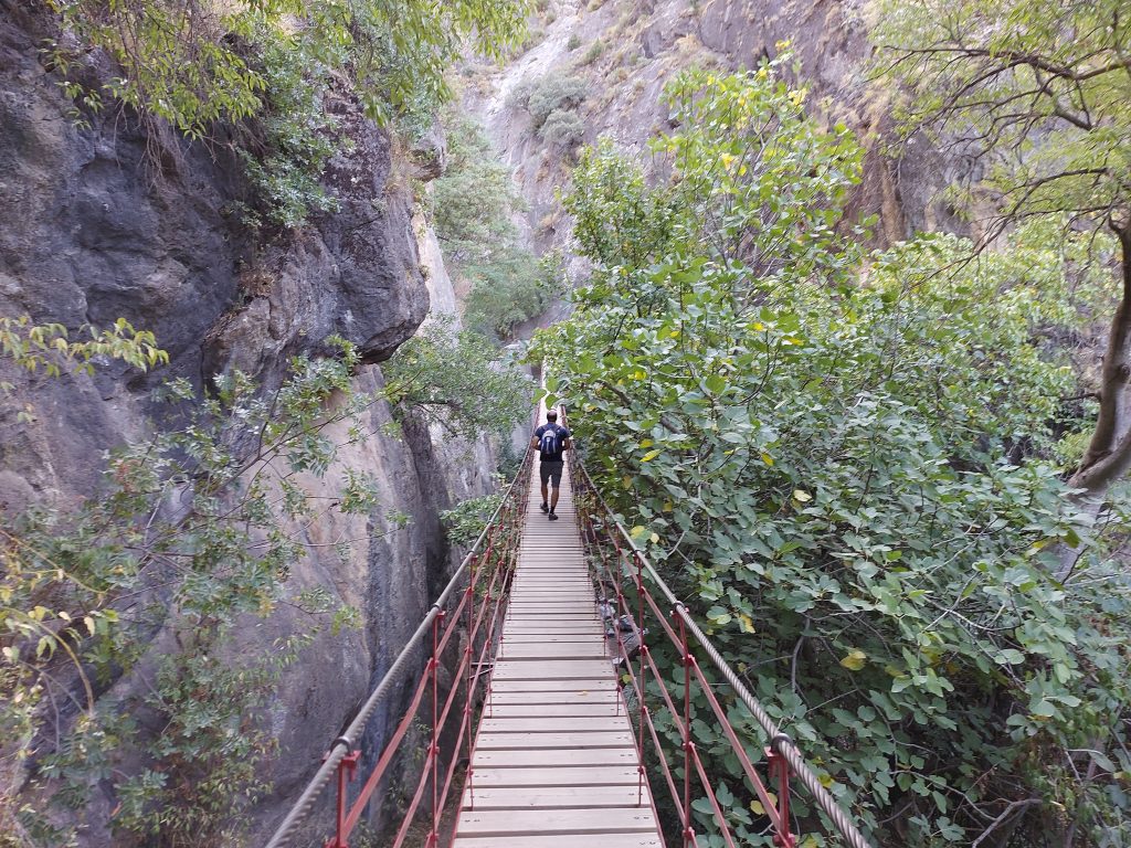 To je eden izmed nenavadnih pohodov, ki očara s čudovito sotesko, lepimi razgledi, številnimi brvmi ter zaključnim delom po ruralni pokrajini. Prvi del poti, ki se začne v vasi Monachil, je sila enostaven, saj poteka ob istoimenskem potoku. Ko pridemo do prve brvi, se začne pravo doživetje. Preden prispemo do najdaljše izmed njih, lahko krenemo nekoliko v drugo smer, saj se tu odprejo čudoviti razgledi na sotesko in okoliške hribe. Ob prečkanju najdaljše brvi se soteska zoži in tu se pravo doživetje šele začenja. Pot poteka nekoliko nad potokom in je ponekod tako ozka, da si moramo pomagati z oprijemali v steni. Mestoma je stena nekoliko poševna, kar pomeni, da se je pod njo treba plaziti po kolenih, na enem mestu pa celo po trebuhu. Če je vode v potoku manj, se lahko tem oviram izognemo s hojo ob njem, ob visokem vodostaju pa je plazenje neizogibno. Ko se ozek del zaključi, nas čaka zadnje prečenje brvi ter obrat proti izhodišču. Ker je pot krožna, najprej hodimo po zelo razgledni široki makadamski poti, kjer se odpira mnogo prelepih razgledov. Ko se ta del konča, se začne dolg serpentinast vzpon do malega prelaza, kjer se nahajajo številni oljčni nasadi. Tu se začne pot skozi podeželje ponovno počasi spuščati proti vasi Monachil.