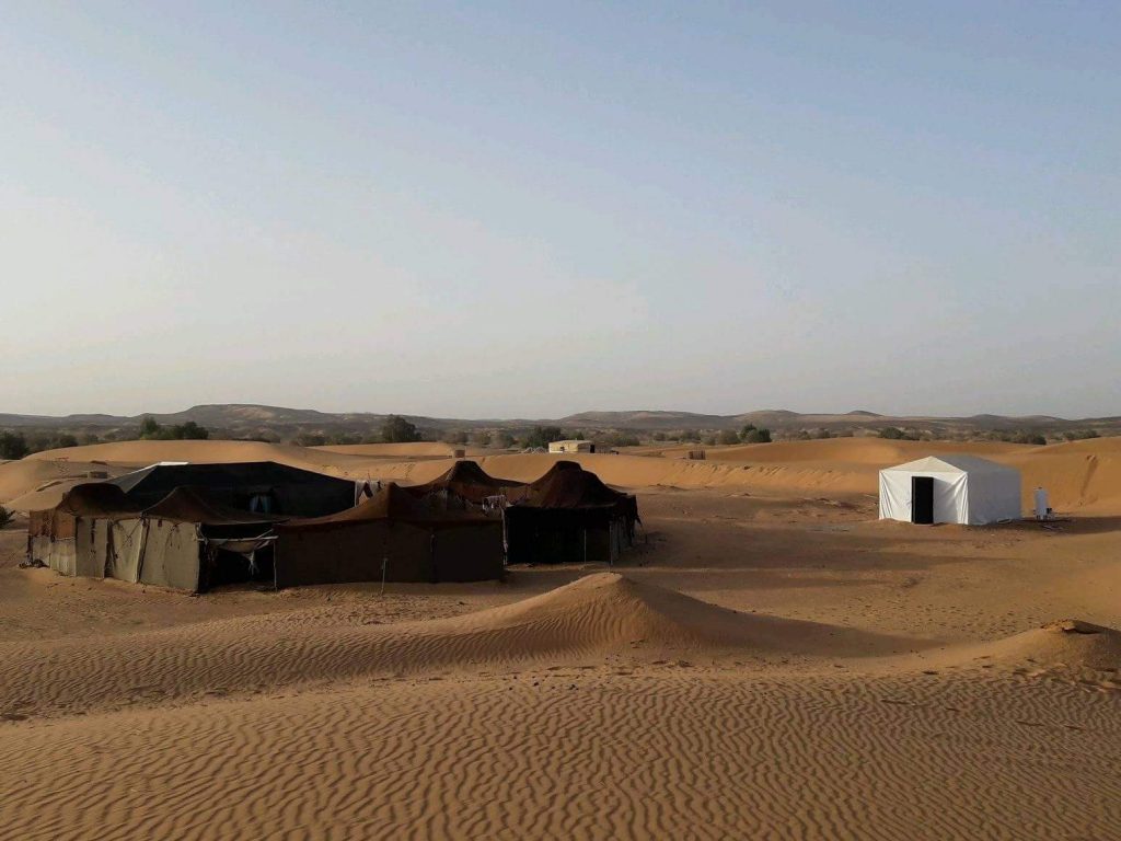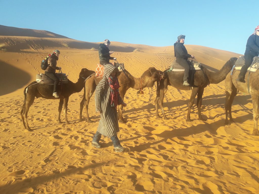 Nekaj izjemnega in neponovljivega je noč v puščavi. Iz obpuščavske vasice Merzouga gremo pozno popoldne s kamelami na dolg pohod do oaze. Tam se namestimo v šotorih, čeprav kasneje skoraj vsi raje spimo kar zunaj pod zvezdnim nebom. Naši sodelavci – kamelovodci nam skuhajo izjemno dober tajine (v posebni posodi z visoko pokrovko se duši lokalna zelenjava in meso z obilico slastnih in dišečih začimb). Saj ne vemo, a je res tako dober, ali je to zaradi fantastične okolice in lakote. Po večerji se razleže glas bobnov in otožna berberska glasba.