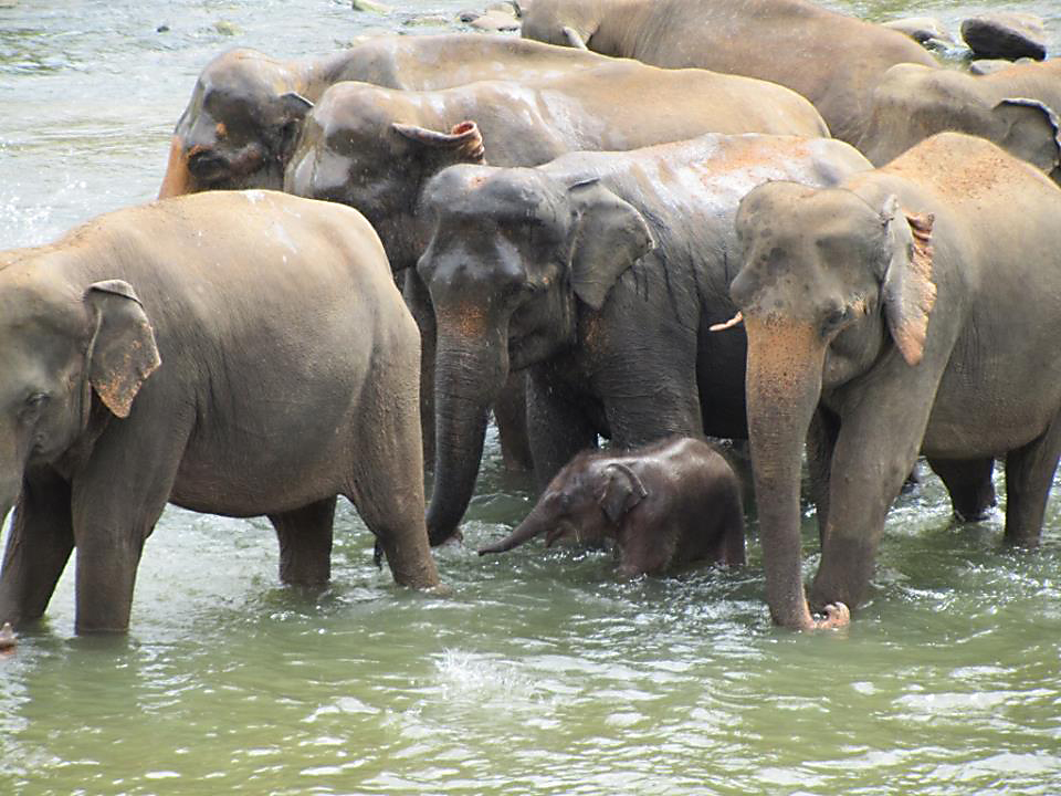 Slone smo imeli možnost opazovati še dvakrat. Najprej divje slone v narodnem parku. Nikoli si ne bi mislila, da je slonova barva tako učinkovita. Si lahko predstavljate, da gledate v velike slone iz oddaljenosti 10 metrov, pa jih ne vidite, zakriva pa jih nekaj vejic skoraj posušenega drevesa? Šele ko se začnejo sence slonov premikati, vidiš, da se premika slonja kolona. V Pinawali smo si ogledali tudi sirotišnico, za katero prav tako upam, da služi pravemu namenu. Po enih trditvah tam skrbijo za slončke brez mater in jih tam vzgojijo v odrasle osebke, sliši pa se tudi, da slončke ugrabijo iz divjine in morda niso vsi sirote. Kdo bi vedel. V sirotišnici ni bilo videti nič spornega. Če se kaj slabega dogaja, se zagotovo ne dogaja pred našimi očmi. Verjamem pa, da se Šrilančani veliko bolj zavedajo vrednosti in pomena slonov (kot na primer Indijci), da jim zdravi lahko dajo več. Veliko pri tem pomaga tudi v državi prevladujoča budistična vera, ki uči, da ne smemo povzročati trpljenja nobeni obliki življenja.
