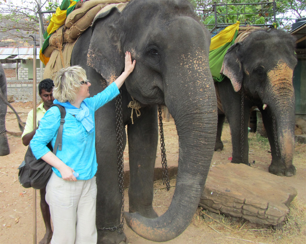 Menda lahko slonja leta primerjamo s človeškimi. Pred ježa sem kupila vrečko priboljškov za slona (zelenjavo), ker je to dodaten zaslužek za domačine in veselje, motivacija za slona. Tako me je ves čas prosil z rilcem: »No, daj mi že nekaj, na primer bučko, kumaro.« Malo je hodil in je spet prosil. Njegov prijem je bil zelo natančen, konec rilca predstavlja slončku občutljiv prst in je sposoben res prave finomotorike. Po ježi sem želela svojega junaka pogledati v oči in ga pobožati. Sem prej omenila, da čutim do slonov strahospoštovanje? Ko sem stopila do slona in ga pobožala ter ga pogledala v oči, je on s skrajno nežnostjo vzel še moje zadnje darilce, bučko. Najraje bi ga vzela v naročje, pa je to bilo seveda neizvedljivo. Čisto nič me ni bilo strah velike živali. Mogočni slon je bil še zmeraj mogočen, toda zaradi njegove pozitivne in mirne energije sem imela občutek, kot da se družim s kakšnim zlatim prinašalcem, ki se želi z mano pocrkljati. Prav hudo mi je postalo, ko sem se morala posloviti. Samo upam lahko, da ravna njegov lastnik z njim spoštljivo.
