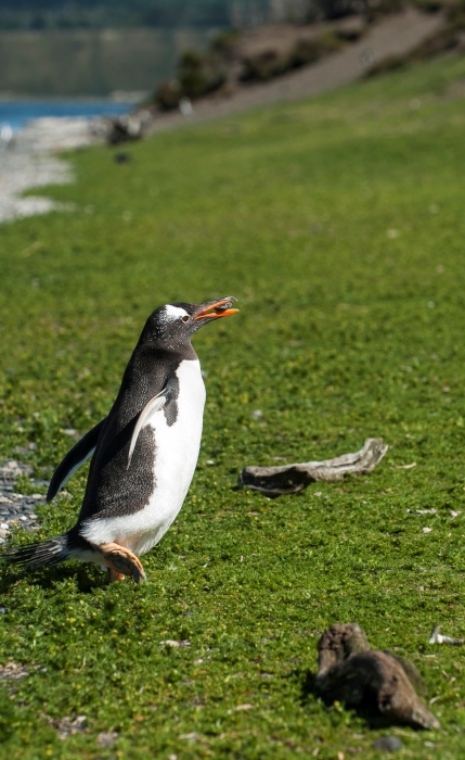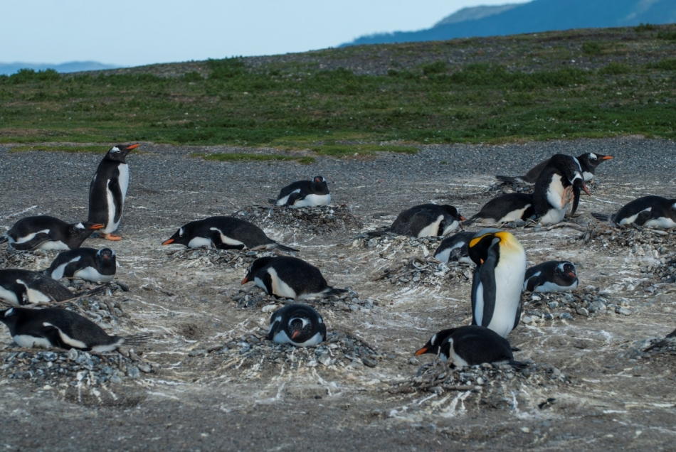 Ornitološka zvezda dneva (če ne kar celotnega potovanja) pa je sledila popoldne. Najprej po makadamski cesti in nato z gumenjakom še po vodi, smo se odpravili do otoka v Beaglovem prelivu. Po poti nam je vodnik razložil pravila obnašanja na otoku, mi pa smo se pripravljali – dan je bil čudovit, morje je bilo mirno, mi pa smo bili namenjeni obiskat pingvine! Ne morem opisati, kakšen občutek nas je vse preveval – kot bi se spremenili v otroke, dojenčke v bistvu, ravno, ko se naučijo plaziti. Vsi smo se gugali skupaj z njimi, se plazili po trebuhih, da bi jih lahko bolje videli in fotografirali. Od sedemdeset letnikov pa do 130 (in nekaj) – kilske Američanke, vsi smo bili kot otroci. In pozabili na bolečine (morali bi videti Američanko, ki se je prej komaj premikala, potem pa skoraj tekla za pticami), utrujenost … Okoli nas je bilo vse polno Magellanovih pingvinov, dolgorepih pingvinov in celo en kraljevi pingvin. Vodnik nam je povedal, da je najbližja kolonija kraljevih pingvinov oddaljena več sto kilometrov, a ta je zašel na naš otok. V bistvu je bilo kar malo žalostno gledati to čudovito ptico v svoji rumeni barvi, ki je sama ždela obkrožena z drugimi vrstami.