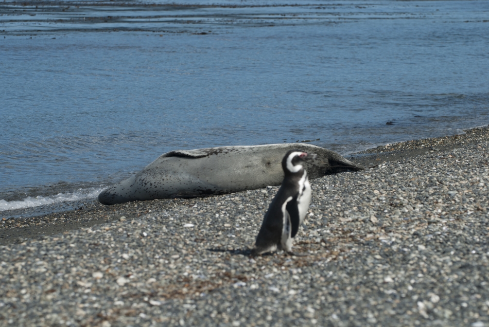Ni bil pa to edini osamelec na otoku: na obali je namreč počival morski leopard! Glavni plenilec pingvinov je počival na plaži, nekaj metrov stran pa se je veselo sprehajal njegov glavni plen! Je že res, da morski leopard za lov potrebuje prav to, morje, medtem ko je na kopnem nenevaren.