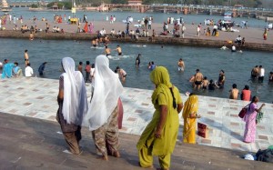 Postrežejo nam s kavico in počasi zapuščamo mesto… Vožnja mine izjemno hitro. Okolica je enostavno preveč zanimiva in čas dobiva druge razsežnosti. Sploh pa, kaj je pet ur vožnje v Indiji. Praktično nič… Haridwar je hitro tukaj in že se je treba znajti v novem mestu. Tokrat manjšem in prijaznejšem. Kot nalašč vse hotele, kjer vprašam za sobo, prenavljajo! Na koncu vzamem edino že prenovljeno sobo v zadnjem hotelu in se takoj odpravim proti centru mesta, k sveti Gangi. Najbolj sveta reka Indije je sigurno Ganges in teče ravno skozi Haridwar oz. stoji mesto ravno na njenem obrežju… Čudovito je. Poseben občutek in močna energija. Povsod sveti možje – sadhuji oz. babe. Mnogo romarjev, ki se zgrinjajo k reki, da bi se očistili vseh grehov in uživali v njejni bližini… Ozke uličce peljejo k glavnemu delu mesta, k glavnim kopalnim vratom. Povsod so trgovinice z raznoraznimi spominki in pisanimi stvarmi, ki vabijo k sebi… Tu so tudi številni lokalčki s hrano, trgovinice ki prodajajo sveže pripravljene berfije – mlečne slaščice in na vogalih prodajalnice, specializirane v prodaji sveže pripravljenega lassija. Treba je biti pozoren na gnečo ljudi, med katero se trudijo voziti še bicikel rikše in motorji, kolesa… A kar naenkrat se nariše pred nami prekrasen prizor osrednjih vrat z množico ljudi. Pomešam se med njih in se bližam sveti reki…
