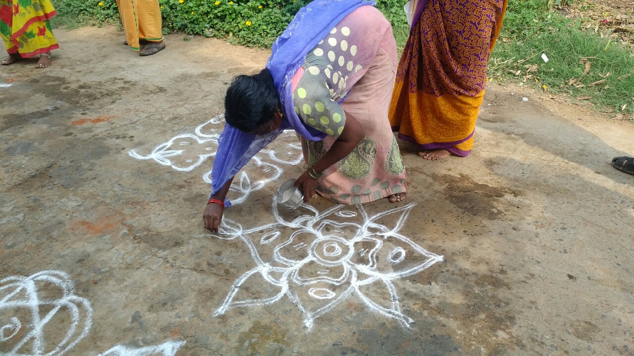 Sprehodili smo se nazaj po isti cesti na drugi konec vasi. Najprej so na cesti prikazali kako rišejo kolum. Vzorce iz nekoč riževega prahu, ki je s svojo sladkobo obvaroval hišo pred mravljami, danes pa je zaradi drugačnih materialov to le dekoracija in spiritualna zaščita hiše. V enem skromnem domovanju so domači otroci pokazali svojo najvrednejšo lastnino. Vsak je imel eno igračo. Spuži vratnik je imel posebno mesto pri edinemu fantu v hiši. K njim smo se še vrnili na cvrtje papade. Vmes pa smo nadaljevali z ogledom vasi in posebej za nas so pripravili kratek obred, kjer so prosili za blagoslov pri Ganeši.