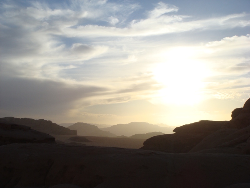 Eden najlepših predelov Arabske puščave se proti jutru počasi umiri. Prebudimo se v njegovo značilno zlato-rdečo pokrajino. Dva dneva pohajkovanja po Wadi Rumu, ki je raznovrstna kombinacija peščenih dolin in skalnatih klifov, sta presegla vsa naša pričakovanja. Večino poti smo prehodili izven zavarovanega območja parka, zato smo srečali le redko katerega turista. Med hojo je bilo oblačno in ves čas je rahlo deževalo. Prav zaradi tega hoja ni bila naporna, saj so oblaki in dež prijetno ohlajali ozračje.