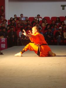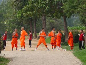 Njegova obrita glava in visoko čelo govorita o življenju v samostanu, njegovo ohlapno oranžno oblačilo malo svarilno plapola v lahnem vetriču, nogi mu ovijajo tesno prevezani beli trakovi, ki se končujejo tam nekje pri obuvalu, ki smo mu nekoč v Jugoslaviji rekli Startarke (superge)… Zanimivo, da stojim sredi Kitajske in se sprašujem o tem, kdaj sem nazadnje videla podobne copate. Nehote se spomin vrne v otroštvo, ko smo se preganjali po ulicah domačega naselja, ali pa v podobnih supergah skakali “gumitvist”. Tako daleč, a vseeno tako blizu! In meni nič, tebi nič sem takole soočena z naslednikom rodu najbolj smrtonosnih borcev Kitajske, mah kaj Kitajske… kar Sveta! Tukaj, nasproti mene, pa ne zgleda prav nič nevaren. Mirno stoji in čaka, da dokončam potovanje v svoje otroštvo in se vrnem v “tukaj in zdaj”. Vsega skupaj sem le nekaj sekund tavala po svojih spominskih poteh, a zdi se da je tale mladec tukaj, tik za mojimi petami. Malo nelagodno ga odrinem iz samo svojih spominov in se vrnem na Kitajsko (svoje stare superge pa vseeno še vedno pogrešam).