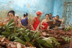 Pred poletno pasjo vročino in vlago smo se zatekli na lokalno tržnico. Na stojnicah je bilo moč opaziti večino sadja zelenjave in pridelkov, ki jih gojijo na Kubi. Za nam smešno nizke cene v Nacionalnih pesih si lahko kupil, kar ti srce poželi. Rjave korenine so Yuka, korenina, ki jo uporabljajo domačini namesto krompirja. Da ne govorim o sadju! Prisotne so bile banane – platanos po Špansko- vseh velikosti; XS, S, M, L za uživanje kot sladke zelene banane. In ogromne banane – XXL – platani namenjeni kuhanju in podobnemu načinu uživanja kot krompir – v omakah, pečene, pražene ali kuhane so mi ponudile paleto meni nepoznanih okusov.