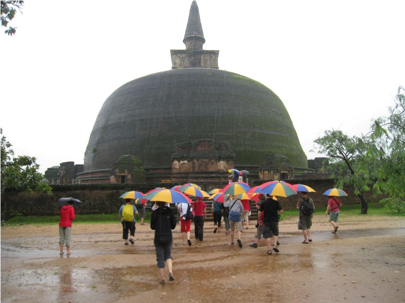Prvi teden potovanja je nenehno deževalo. Še dobro, da smo obiskovali budistične templje v Polonnaruwi, Anuradhapuri in Dambulli. Ker se je treba pred vstopom v tempelj sezuti, nas topel monsunski dež ni preveč motil. Medtem, ko smo pili čaj ob Perakrambahujevem morju, sta naš lokalni vodnik »Janez« in njegov pomočnik »Srečko« preiskala vse vaške trgovinice in kupila dvajset pisanih dežnikov. Z njimi smo nato hodili naokrog in bili bolj podobni japonskim turistom. S pisanimi dežniki smo jahali tudi na slonih.