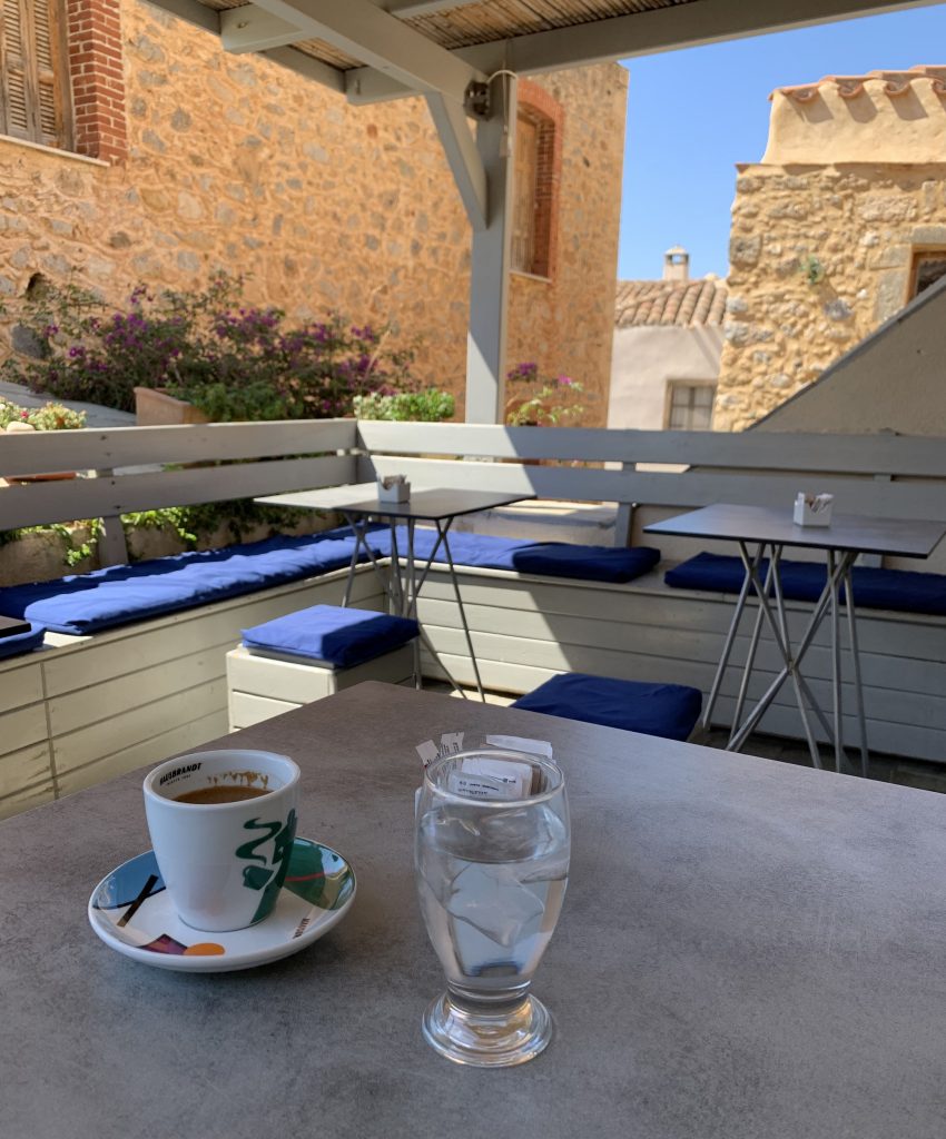 Sedim v svojem najljubšem skritem kotičku Monemvazije. To je na videz običajna kavarna, za katero pa se skriva terasa. Čas se ustavi. Dopoldansko sonce, globok vdih morskega zraka in srebljaj grške kave ustvarijo občutek brezčasnosti. Za to je vredno potovati!