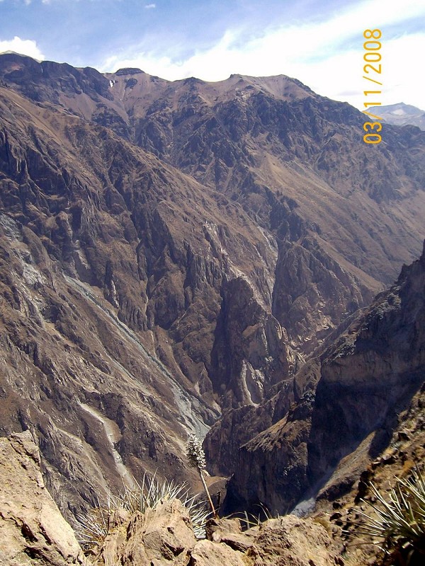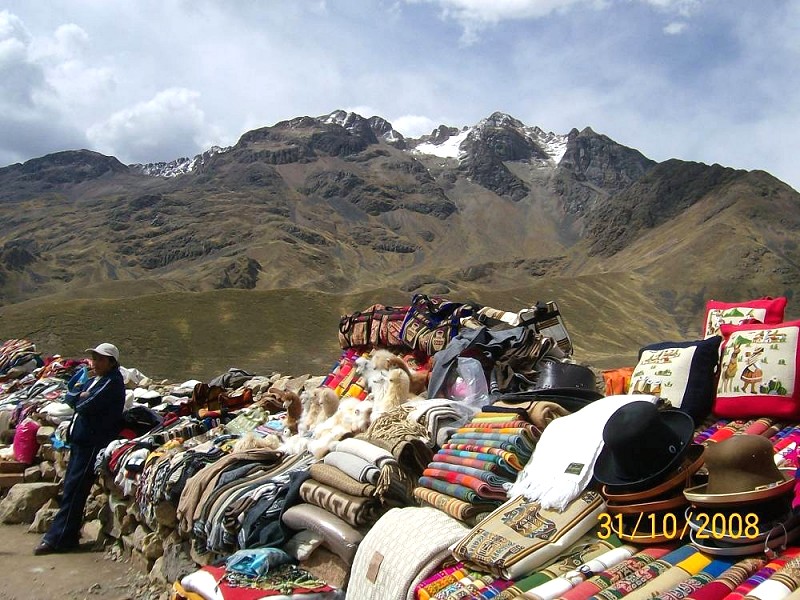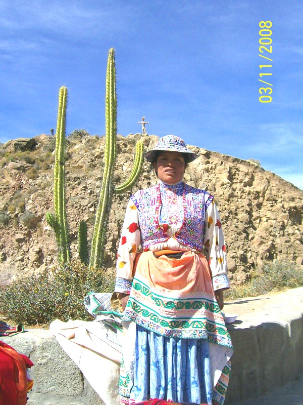 Večkrat smo se ustavili na ‘miradorjih’ – razglediščih, na katerih so ženske povsem oblečene v andaluzijske noše, katere so se tu ohranile od prihoda Špancev, ponujale najrazličnejše pletenine. Tudi velike torbe z inkovskimi motivi; moja predstavlja samega Intija – boga sonca, ki smo si jih nekatere turistke morale kupiti, da smo lahko spravile vanje vse nakupljeno. Bo sploh komu všeč ‘baby alpaka’ pulover? Pa jopice, rokavice, nogavice – vse skoraj zastonj, a v veliko veselje mene kot kupca in še večje veselje, ki je odsevalo iz prodajalčevih oči. Na razglediščih, ki so ponujala poglede na zasnežene slapove šesttisočakov, obdelane terasaste njive okoli višje postavljenih naselij, smo lahko globoko spodaj le slutili  3.191 m globoko sotesko. ‘El condor pasa’ je bila želja, vendar ga zaradi množice turistov ni bilo, vsaj tisti čas ne. Na sprehodu med ogromnimi kaktusi in po lepo urejeni okolici tega narodnega parka tudi višinske bolezni nisem več čutila. Prav tako ne na najvišjem prelazu Visokih Andov na 4.910 m, na  vulkanskem pobočju, kjer nam je do bližnjega pettisočaka zelo malo manjkalo. Po prašnih skalah in močnem vetru smo se pognali na to posebno ‘trofejo’ in jo ovekovečili še z izjemno redko rastlino teh višin – yareta, podobno mahu, a na dotik trdo kot guma, ki je dobesedno prilepljena na  kamenje. Povsem drug svet – mrzel, prašen, napol mrtev, skoraj res vulkanski.