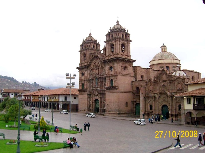 Podoba je res enkratna, nobene visoke hiše, razen katedrale in številnih cerkva. Na glavnem trgu, na Plazi de Armas, stoji mogočna katedrala, katere en del je na temeljih starega templja Suntur Wasi – božje hiše. Vsebuje številna platna kuskuanske šole, kar pomeni, da so se slikarji približali temu delu sveta, tako je npr. zadnja večerja zanimiva z morskim prašičkom na mizi in južnim sadjem, ki ga v Evropi ne najdemo. Tudi Kristusi so drugačni, temnejši ali pa v belem ogrinjalu, križi pa manj vidni, nekje od zadaj prekrižani, tako da je  križ bolj podoben debeli palici na rami. Španci so katedralo gradili več kot sto let, predvsem  zaradi številnih potresov, dokončana je bila šele sredi 17. stoletja. Medtem pa so Jezuiti v bližini postavili svojo cerkev, ki naj bi bila lepša, La Compania de Jesus. Menda je notranjost res vsa zlata, kar najlepša v celotnem Peruju, a tistega dne ni bila na ogled. Mrzel večer z obilnimi padavinami in grmenjem me je spomnil, da smo ne le nekje na južni polobli, temveč tudi precej visoko. Kakor hitro so se oblaki pripodili, tako hitro so se tudi porazgubili in v jasnem dopoldnevu smo si ogledali inkovski Tempelj Sonca – Coricancho, zgrajen okoli leta 1400, ki naj bi predstavljal središče sveta in vesolja, kjer so vsako leto 24. junija praznovali zimski solsticij in pripravili veliko slavje. V niše templjev so postavili praznično odete mumije svojih umrlih sončnih bogov, na vrt pa zlate kipe bojevnikov, živali in rastlin. Po zasedbi mesta so Španci na temeljih svetišča postavili cerkev in samostan svetega Dominika.
