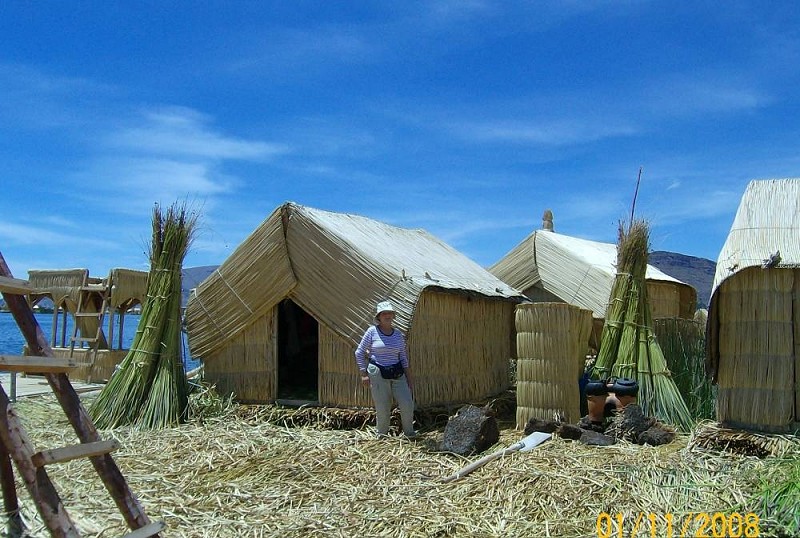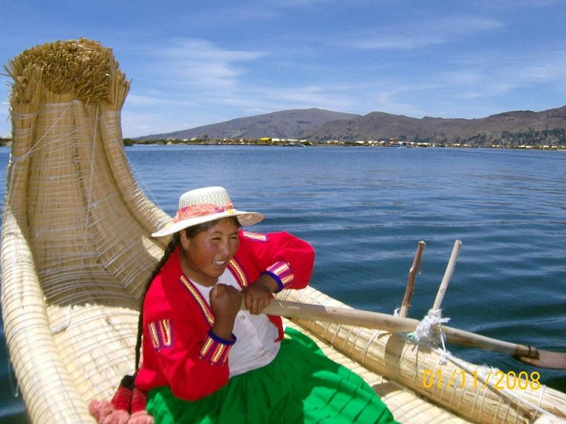 Toliko postrvi ne pojem doma celo leto kot sem jih tu v dveh tednih. Lokalni vodič, ki nas je spremljal po jezeru, se je naučil angleško v dobrem letu in pol, najprej v turistični srednji šoli in predvsem v stalnem stiku s turisti. Dobro izdelan šolski sistem jih že do 16 leta lahko pripelje iz obvezne osnovne šole, šestletne gimnazije do univerze, na katero je precejšen naval in pokriva vsa osnovna študijska področja. Ladjica nas je po dobri uri vožnje odložila na umetno izdelanih otočkih Uros, pravzaprav na enem od njih, kjer smo pozorno sledili razlagi, kako se takšni plavajoči otočki iz ‘slame’ – vodnega trstičja totore – sploh naredijo in kako se obnavljajo, tudi pritrdijo na jezersko dno, da jih ne odnese. Iz trstičja potem izdelajo svoje hiške, čolne, z njim tudi kurijo, zgornji vršički pa so tudi okusna hrana. Na enem od teh 40 otokov stoji celo osnovna šola, da se otrokom ni potrebno voziti v Puno! Prijazni domačini so nas popeljali na svojih čolnih na krajši izlet med otočki in nazadnje so mladenke v pisanih rdeče zelenih oblačilih zapele nekaj pesmi v svojem jeziku ajmara, pa tudi angleško božično “Twinkle, twinkle little star”!