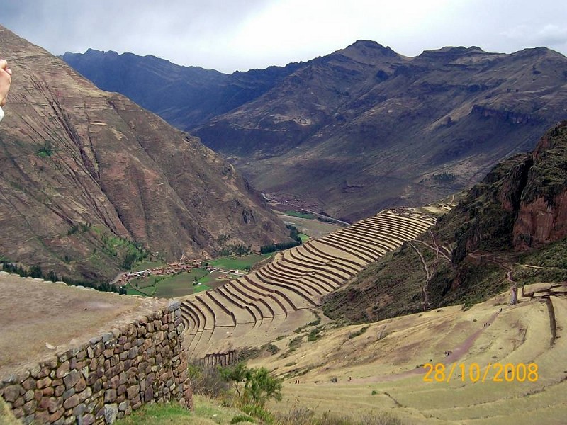 Velika družina in veliko zadovoljstvo je sijalo z njegovega obraza. Moje zadovoljstvo pa je bilo, da sem se lahko sporazumela tudi v španskem jeziku in mimogrede ponovila vse pomembne sorodstvene vezi! Kako smo si različni, kako v Evropi drugače sprejemamo preprostost! Po krajšem kosilu v preprosti gostilnici z vsemi posebnostmi inkovske prehrane, tudi slavno juho iz kinue (inkovskega riža), ki se je prilegla v hladnem dnevu, smo odpotovali močno navkreber do arheološkega najdišča Pisaq, do katerega smo se pošteno utrudili po sloviti Inka trail, turistični inkovski poti, tudi nekoliko plezanja je bilo vmes. Ker so se še vedno valili bliskajoči temni oblaki nad čudovitimi terasastimi polji v dnu doline in na pobočjih, sem morala pošteno pohiteti, saj sem bila brez dežnika in moj anorak bi naliva ne prenesel. Imeli smo srečo, da so se oblaki odmaknili v drugo smer, vendar se še vedno spominjam neskončne žeje, ki me je pričakala na cilju. K temu je pripomogla tudi višina z redkim zrakom na tem dolgem pohodu.