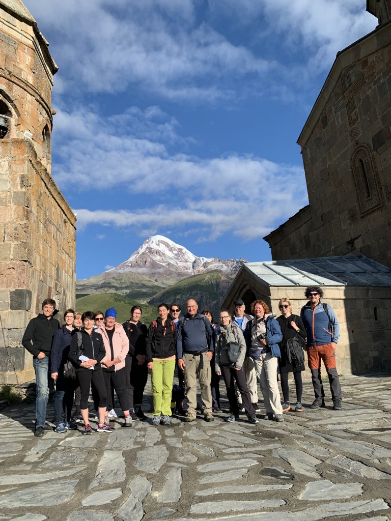 Pot nas je najprej vodila po vasici, čez most, potem pa na levo in navkreber. Zlagoma se je dvigovala, ni pa bila strma. Vsega skupaj smo naredili okoli petsto višincev in proti vrhu končno ugledali naš cilj – malo cerkvico in samostan, v katerem še danes živi nekaj menihov in leži na odlični lokaciji med vršaci in nad vasjo. S severne strani ponuja razgled na Kazbegi, tretji najvišji gruzijski vrh, ki leži na meji z Rusijo. Vrh je visok 5054 metrov in je zasnežen. Pravi balzam za popotniško in pohodniško dušo.