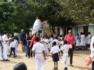 Ko smo prišli na območje Nuware Eliye, smo si vzeli čas za obisk šole. Potnikom sem povedala zgodbo o dolgotrajnem iskanju ‘učencev z vlaka’ in vsi skupaj smo upali, da smo tokrat le našli pravo šolo. Z avtobusom smo se pripeljali do šolske stavbe, vzeli smo vrečke z zvezki in ostalimi potrebščinami in se vsi skupaj odpravili proti učilnicam. Otroci so bili obveščeni o našem obisku, pritekli so iz učilnic in nas veselo pozdravljali. Nato opazim dve deklici, ki me zvedavo gledata. Pristopili sta do mene in mi z iskricami v očeh dejali: ”Spomniva se te. Ti si vodnica turistov iz vlaka. Na sebi si imela rdečo jopico. Vsi smo se peljali v Ello.”