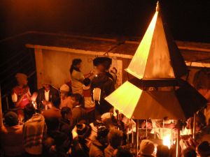 Mi premagujemo stopnice, opremljeni športno, kot za hribovski vzpon. Domači romarji so oblečeni v najlepša oblačila. Dekleta v bela krila, moški v bele hlače… Pomagajo si in sem ter tja koga tudi nesejo. Še posebej navzdol, ko izdajo boleče mišice… Vsi nosijo kape. Dober posel ima tisti, ki jih je začel prodajati ob vznožju. Sem in tja ti želi kdo v zameno za nekaj rupij zavezat trakec za zaščito okrog zapestja. Moj je že star in obrabljen, zato ga zamenjam.