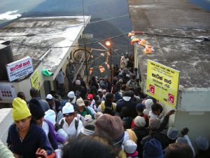 A tudi trpljenja je enkrat konec. Ne še takoj, ko dosežemo vrh ob zgodnji 4. uri. Kajti takrat se šele začne. Množice na majhni ploščadi… Nekaj pokritih prostorov, kjer so prenočili najbolj zavzeti. Hladno je, veter piha, zavetišča ni. Tam nekje spodaj so zakurili ogenj v čast bogovom. Stopimo dol. V ogenj mečejo prav vse. Smrdi. Malo pa le pogreje… Da le veter ne piha naravnost v obraz, pa smo že na boljšem… Vsi v istem zosu, bi rekli po domače. Lahko bi šli dol. A se ne damo. Če smo že prišli, ga bomo dočakali. Sončni vzhod namreč. Na najbolj svetem od vseh vrhov na Šri Lanki… Čas pa teče počasi. Grejemo se z pogovori, čutimo skupaj… Napetost se stopnjuje proti uri vzhoda, vsi želijo na vrh, k svetemu odtisu. Bosi na mrzlih tleh, premraženi do kosti… Dočakali smo.