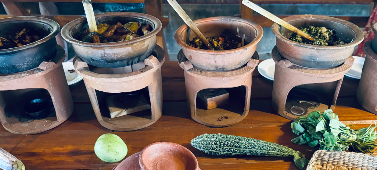 V restavraciji, ki smo jo našli tretji dan, so nas pričakale glinene posode z žlicami, narejenimi iz kokosovega oreha. V vsaki posodi pa različen kari in poleg posode položena zelenjava, ki je bila osnova za tisti kari: spodaj so bučka, repa, bananin cvet, pa melancana in jabolko, pa neke vrste kumara. Izbirali smo lahko tudi med karijem iz manga, jack fruita, krompirja.
