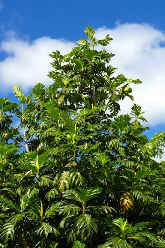 Na prvem popotovanju po Šrilanki smo se med drugim sprehajali tudi po čudovitem botaničnem vrtu. Lokalni vodnik pokaže na veliko drevo z nazobčanimi listi in pove, da je to kruhovec.