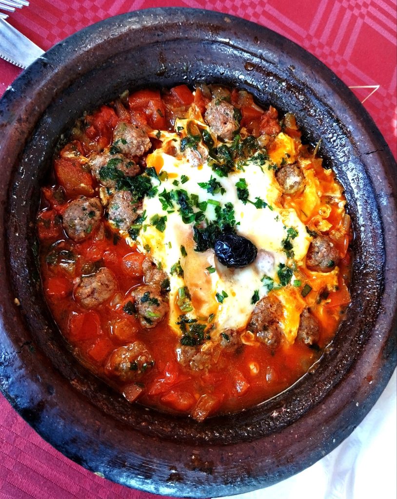 Maroška kulinarika je tesno povezana z berbersko tradicijo. Arabski vpliv je bolj ali manj čutiti le pri uporabi začimb. Večina maroških jedi se imenuje tajine, kar je pravzaprav oznaka za koničasto oblikovano posodo, v kateri so jedi skuhane. Tajini so različnih vrst – od govejega s slivo, piščančjega z limono, zelenjavnega do raznovrstnih kombinacij mesa (goveje, piščančje, ovčje, kamelje) in zelenjave z najbolj pogosto žitarico v Maroku – kuskusom. Čeprav se ob pogledu na meni zdi vse zelo podobno, pa teden dni ni dovolj za pokušanje vseh možnih kombinacij.