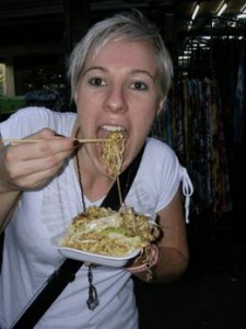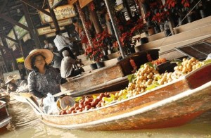 Uff .. Bujenje ob 6h zjutraj in zajtrk (brez riža seveda ne gre:P). Odhod ob 7h proti provinci Kanchanaburi, ki se nahaja okoli 130 km zahodno od Bangkoka. Prvi postanek je bil na plavajoči tržnici v Damnoen Saduak-u, kjer smo lahko videli kako so nekoč trgovali s sadjem in zelenjavo. S čolničkom smo se, tako kot še drugih 1000 turistov, podali v nakupe. Kakšno doživetje! Iz vseh strani te domačini na čolničkih vlečejo in poskušajo, z nasmeški na obrazih, prodati od zelenjave, sadja, suvenirjev, raznih sadnih sokov itd. Vse skupaj se odvija tako hitro, domačini okoli tebe kričijo, enostavno ne moreš spremljati vsega dogajanja. 🙂