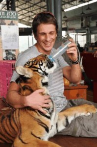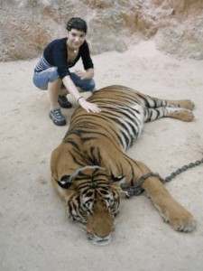 In končno nas je pot vodila do Tigrovega templja (Wat Pha Luang Ta Bua). Glede na to, da sem ljubiteljica vsega kar leze in se premika (beri: živali), mi je bil obisk in bližnje srečanje s tigri ena od stvari, ki sem jih najbolj pričakovala in se jih veselila na popotovanju po Tajski. Sprva je bil tempelj zgrajen za zavetišče rešenih tigrov, kasneje pa je tempelj postal neizbežna točka množici turistov. Pred vhodom v tempelj smo se morali obleči primerno (pokrita ramena, kolena, majice ne smejo biti živih barv). Prihod na »kraj zločina« .. Lokalni vodič nam je podal navodila in postavili smo se v vrsto še z drugimi turisti.