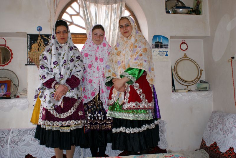 Tu se prične preoblačenje. Moški čakajo izven hiše (ker ima hiša samo en prostor), mene pa Marziye in njena sestra napravljata v dragoceno tradicionalno oblačilo (ženske ta oblačila hranijo kot največjo dragocenost, ki se predaja iz roda v rod). Črne najlonske nogavice (nekaj meni neznanega) in ogromno črno krilo (zanj je potrebnih približno 20 metrov blaga) mi spretno nadeneta. Preko telesa mi povezneta dolgo pisano z zlatimi vrvicami in mavričnimi bleščicami okrašeno haljo. Lase mi pokrijeta z belo ruto, polno cvetličnih vzorcev. Tudi sami se napravita. Sledi če oblačenje moškega dela družine. Potem pa obvezno fotografiranje. Po fotografiranju še lažji obrok sadja, zelenjave, oreščkov, slaščic, čaja ter klepetanje. Marziye me s ponosom predstavlja celotni družini. In že je tu povabilo na kosilo! Zahvalim se in razložim, da bi počasi morala oditi. Marziye se strinja in predlaga, da se vrnemo k njim domov, ko preneha deževati. Tako se popoldne odpravimo, tradicionalno oblečeni, cela družina, preko vasice proti domu. Prevzemajo me pravljični občutki. Na pol poti mi Marziye pove, da me hoče predstaviti tudi družinskim prijateljem. Nimam srca, da bi ji preprečila to veselje. Tako obiščemo tudi družinske prijatelje kjer se ustavimo na čaj in slaščice po protokolu. Preden prispemo domov se ustavimo za družinsko fotografiranje ob cvetočih drevesih. Ko prispemo domov, odidemo še na teraso domovanja na končno fotografiranje. Preoblečemo se v meni bolj domača oblačila. In že ne vem v katero se poizkusim posloviti (razmišljam o prijateljih v mestu kamor se odpravljam, ki so verjetno že v skrbeh zame). Kako, odhajaš, ali ne ostajaš vsaj na poznem kosilu pri nas ? Mi pravi Marziye. Ostani še dan ali dva, pristavi Husayn. Razložim jima, da moje prijatelje verjetno že skrbi in da bodo mislili, da me je kdo ugrabil. Tako se po neskončnem moledovanju in prepričevanju stežka poslovimo. Težkega srca se poslavljam, ker mi je moja nova Iranska družina (do sedaj se jih je nabralo že kar nekaj) prirasla k srcu. Odhajam po svoji poti in moje nove znance nosim v srcu s seboj.
