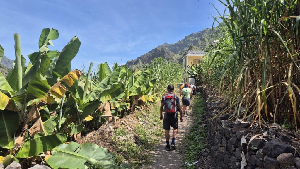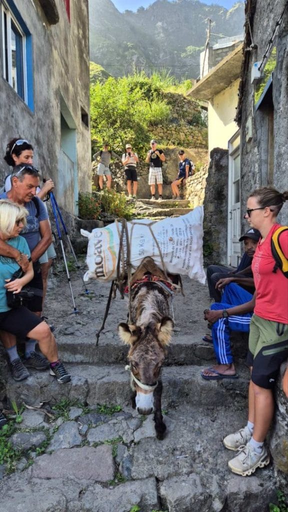 S trajektom smo prišli na Santo Antão, kjer je pristanišče Porto Novo, ki je hkrati tudi glavno mesto otoka. Na začetku je jug otoka še precej pust in suh. Vendar kmalu, ko smo se odpravili proti sredini in severnemu delu otoka, smo začutili, da je tukaj popolnoma druga pesem, kot na São Vicenteju. Santo Antão je zelen in hribovit. Tukaj vse raste: sladkorni trs, banane, papaje, mangovci, kruhovci, maniok, zelje, kava in še veliko drugega. Vreme je toplo in vlažno, zato je vse še bolj bujno. Sprehajali smo se po ozkih poteh, kamor avtomobili ne morejo. Domačini uporabljajo osle, da nosijo težje stvari, mi pa smo hodili med bananovci in mangovci, ki so nam dajali senco. Ogledali smo si tudi krater de Cova, veliko vulkansko razpoko, obdano z zelenjem, hodili po dolini Paul, najbolj rodovitni dolini otoka. Povsod so terase s sadjem in zelenjavo, poti pa so ozke in zavite. Na tem otoku se vidi, kako močno so ljudje povezani z zemljo, in vsak korak po njem je pravo doživetje.