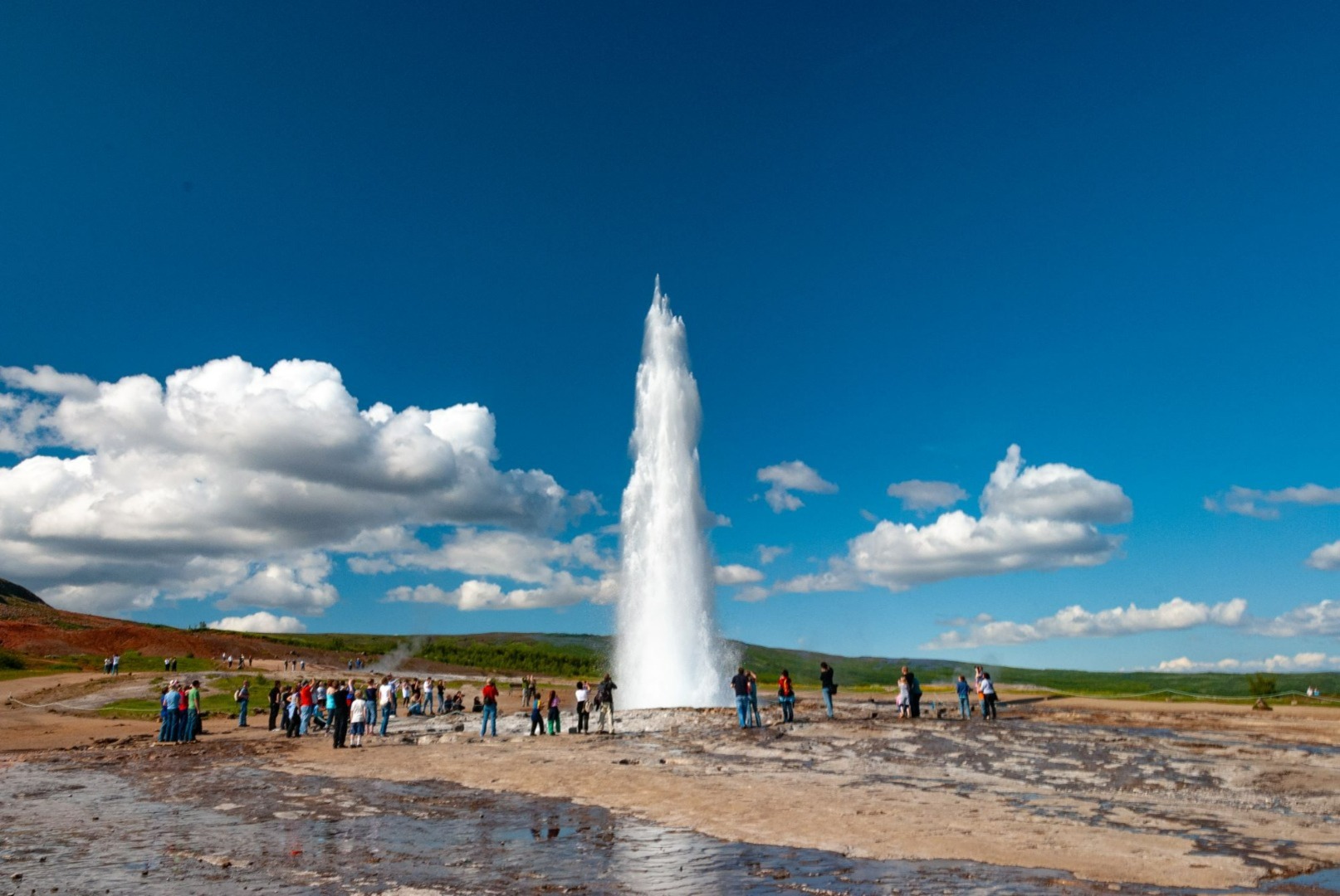 2. dan Zlati krog: Þingvellir, Geysir, Gullfoss in krater Kerið. Zajtrk. Zjutraj se odpravite na krožno pot imenovano “Zlati krog”. Najprej obisk narodnega parka Þingvellir, kjer se razpoka med evrazijsko in severnoameriško tektonsko ploščo slikovito razteza ob jezeru Þingvallavatn. Nadaljujte proti geotermalnemu območju Geysir, kjer izbruhne Strokkur vsakih nekaj minut. Sledi še mogočnost dvoslojnega slapu Gullfoss. Na poti nazaj priporočamo še kratek sprehod okoli živo obarvanega vulkanskega kraterja Kerið. Nočitev v okolici Selfossa ali Helle. (P/H, Z)