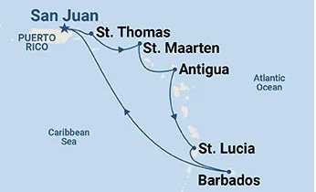 • Odhod in povratek iz pristanišča v San Juanu (Puerto Rico - ZDA) ter postanki na otokih St. Thomas, St. Maarten, Antigua, St. Lucia in Barbados.