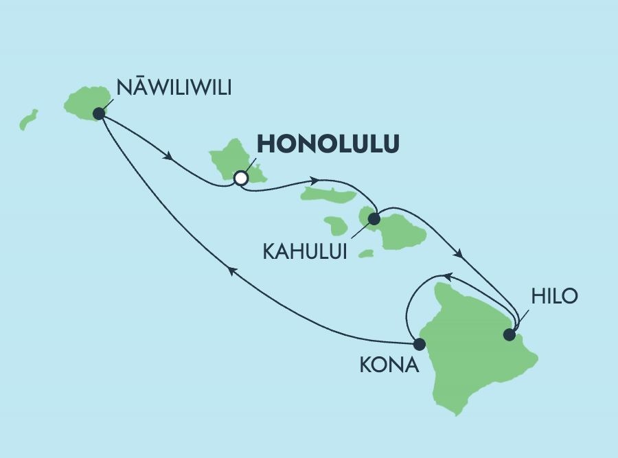 • Odhod in povratek iz pristanišča v Honoluluju (Oahu) ter postanki v mestu Kona (Havaji), Hilo (Havaji), Kahului (Maui) in Nawiliwili (Kauai).