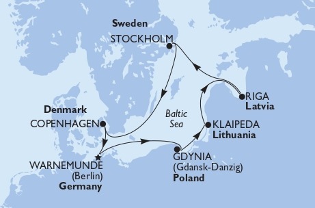 – Odhod iz pristanišča Warnemunde (Nemčija) in postanki v pristaniščih Gdynia (Poljska), Klaipeda (Litva), Riga (Latvija), Stockholm (Švedska) in Copenhagen (Danska)