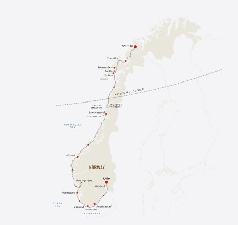 • Odhod in povratek iz pristanišča v Oslu ter postanki v norveških pristaniščih Stavanger, Alesund, Rorvik, Svolver in zaključek v mestu Tromso.