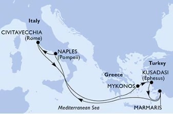• Odhod in povratek iz pristanišča v Civitavecchia (Italija) ter postanki v pristaniščih Mikonos (Grčija), Kusadasi (Turčija), Marmaris (Turčija) in Neapelj (Italija).